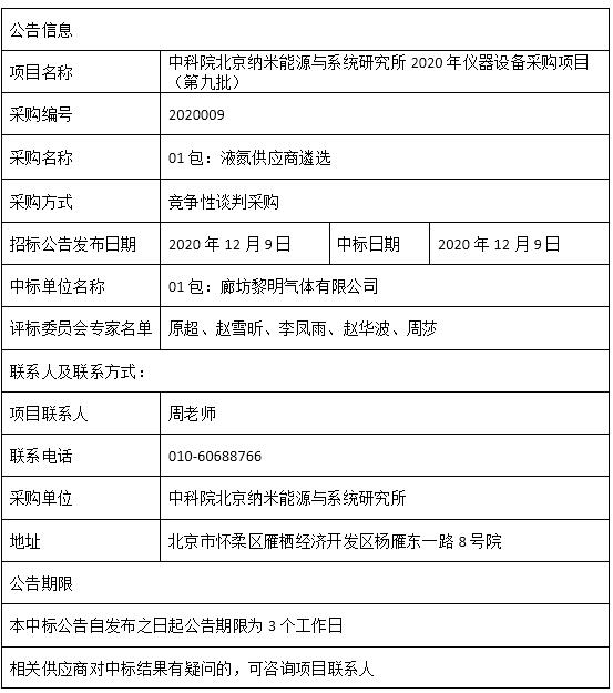 中科院北京纳米能源与系统研究所2020年货物采购项目(第九批)中标公示