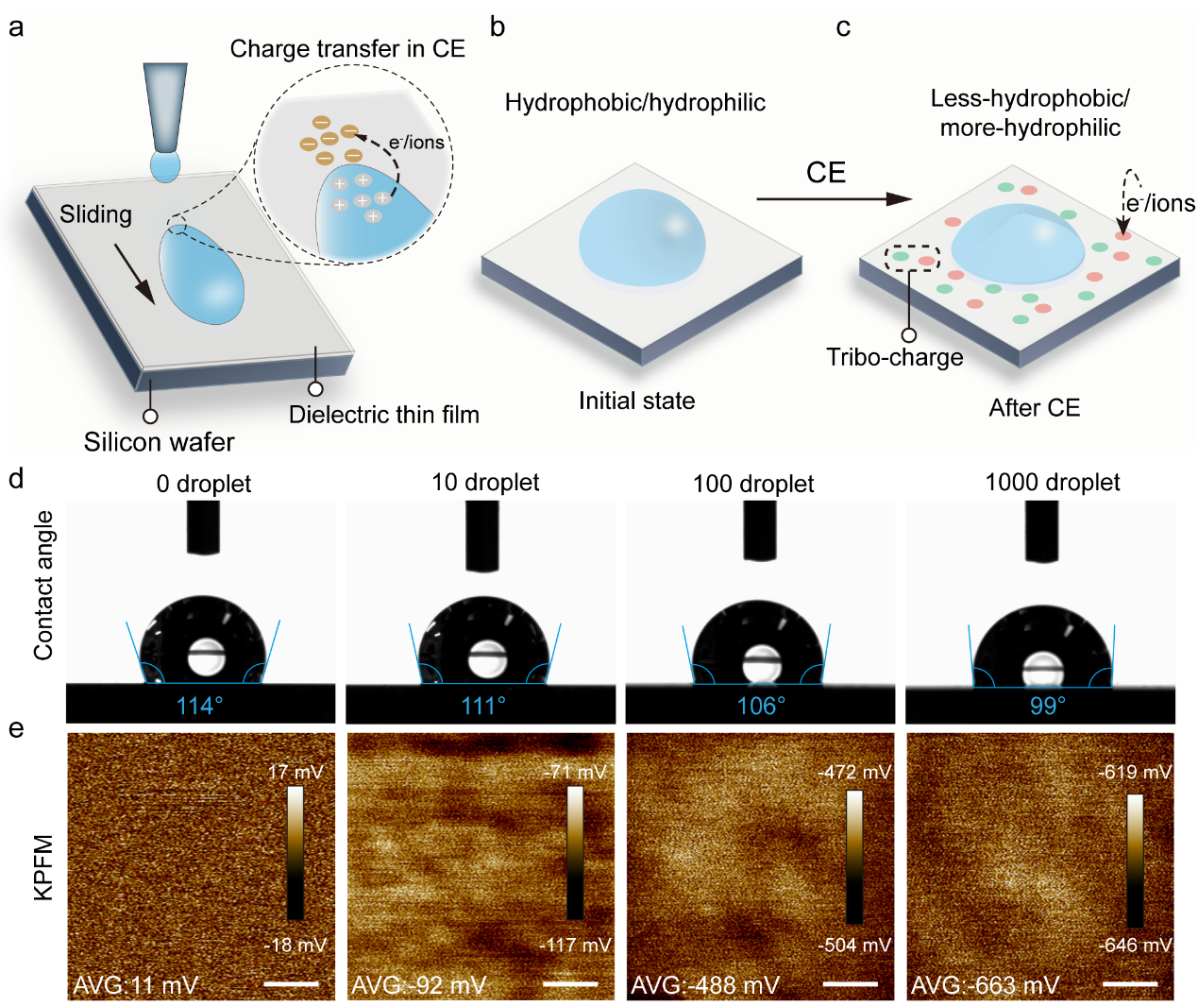 如图1所示,为了研究接触起电和润湿性之间的关系,利用接触角测量仪和开尔文原子力显微镜对的静态接触角和表面电势进行了表征。研究表明经过水滴接触起电的介电聚合物薄膜,其表面电荷量随液滴接触次数的增加而增加,但同时接触角不断下降。这意味着接触起电能够改变固体的润湿性。