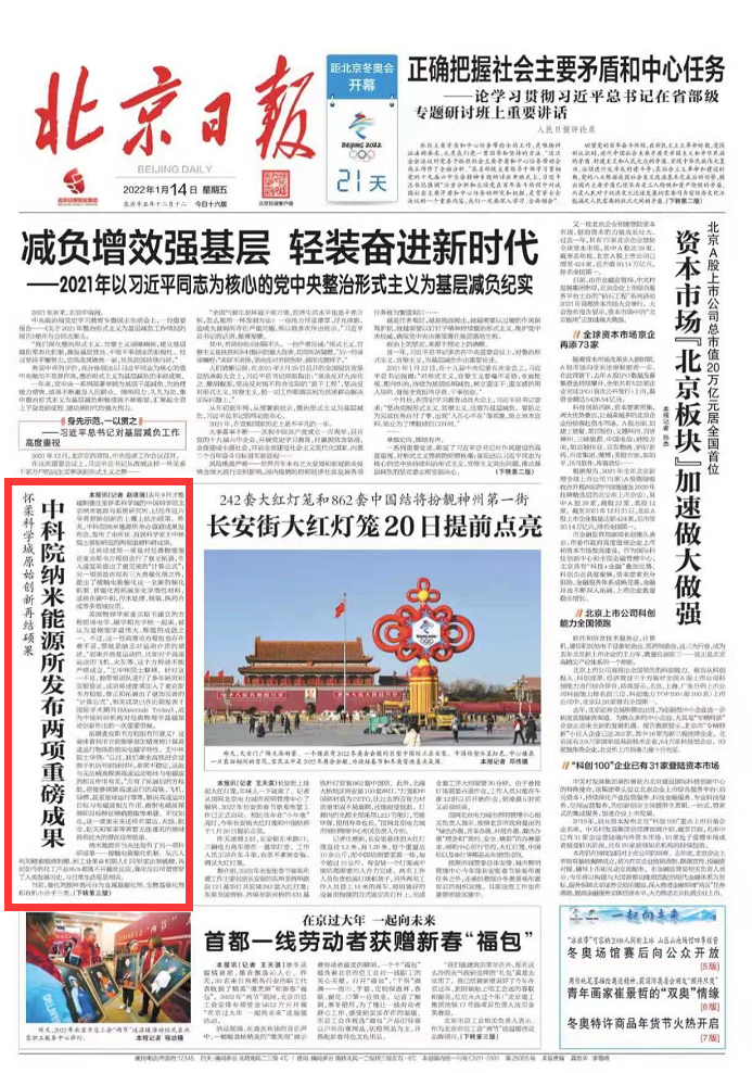 2022年1月13日,中国科学院北京纳米能源与系统研究所召开重大科研进展新闻发布会,由研究所所长、首席科学家王中林院士面向全球公布近期取得的两项重磅科研成果。中国科学院大学,北京市科委,怀柔区政府等单位领导在发布会上致辞,中央广播电视总台、人民日报、中国日报、中国科学报、北京日报、北京广播电视台等多家媒体进行了现场报道。