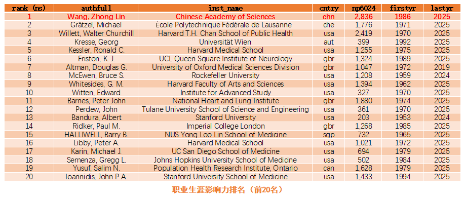2025年9月19日,全球最大学术出版商Elsevier与斯坦福大学公布新一期世界“标准化引文指标全科学作者数据库”(统计数据自1788年起截止到2025年8月1日),即全球前2%全科科学家职业生涯影响力(Career-long impact)排名数据库(共计230,333人)和单年度影响力(Single year impact)排名数据库(共计236,313人)。